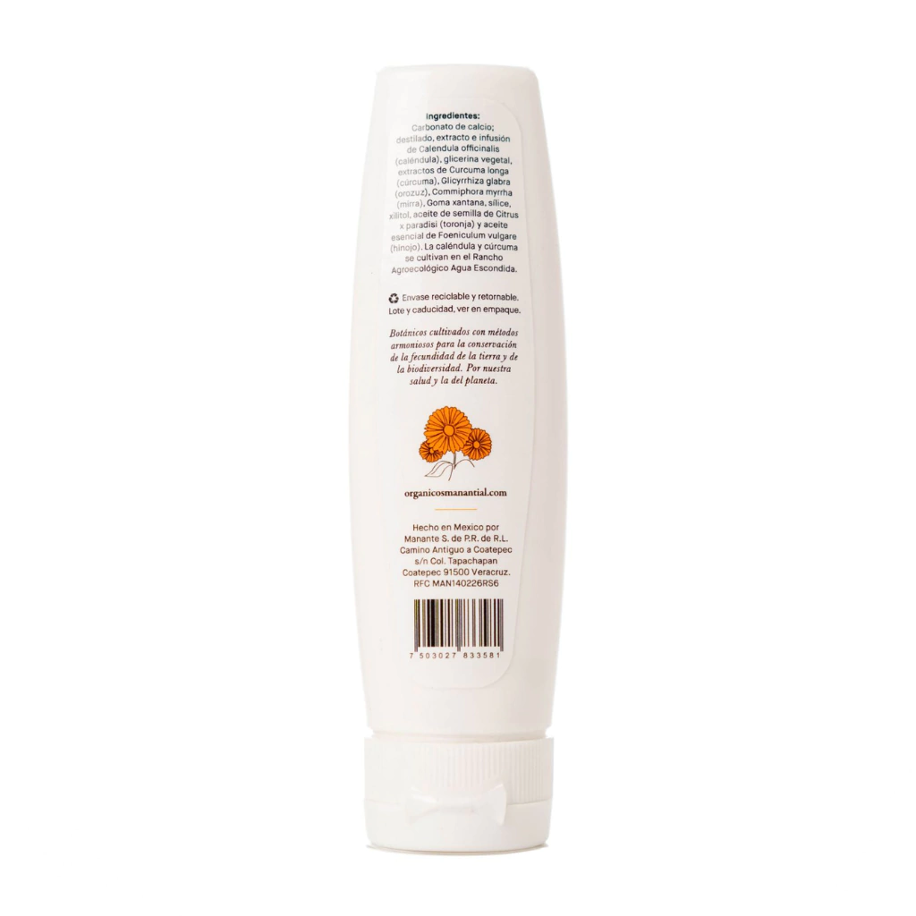 Ingredientes: Carbonato de calcio, agua destilada, extracto e infusión de Calendula officinalis (caléndula), glicerina vegetal, extractos Glicyrrhiza glabra (orozuz), Commiphora myrrha (mirra), goma xantana, sílice, stevia, xilitol, aceites esenciales de hinojo y mirra y como conservador aceite de semilla de toronja.